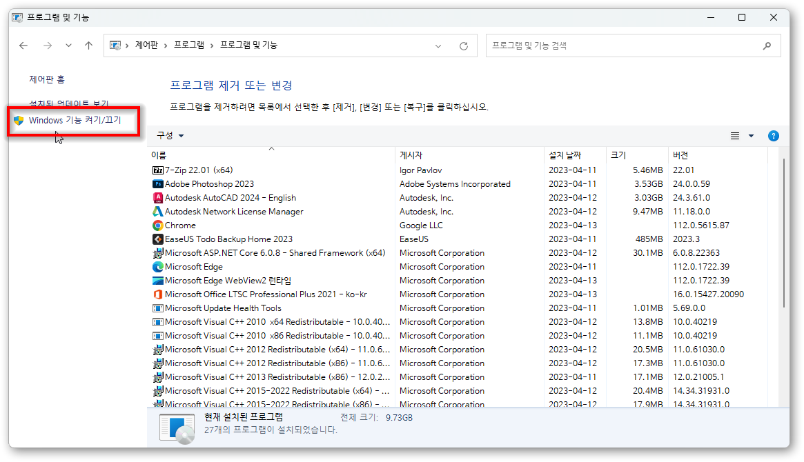 Windows 기능켜기/끄기 클릭