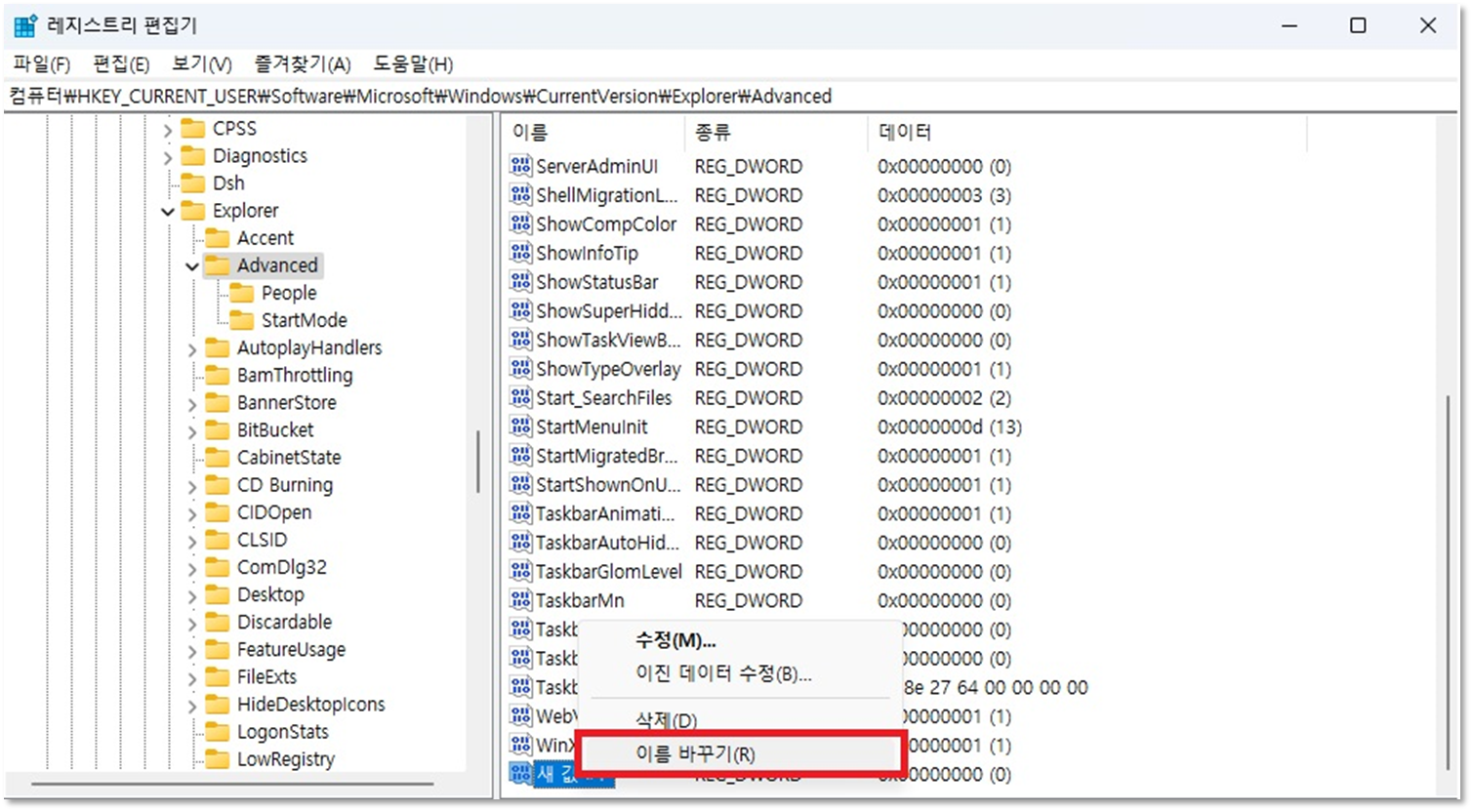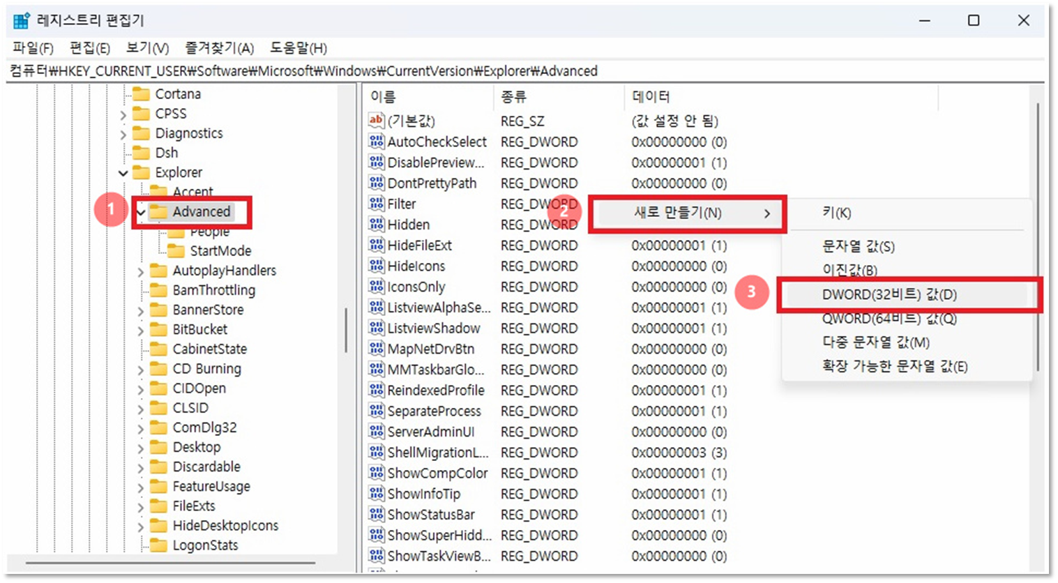 컴퓨터\HKEY_CURRENT_USER\Software\Microsoft\Windows\CurrentVersion\Explorer\Advanced