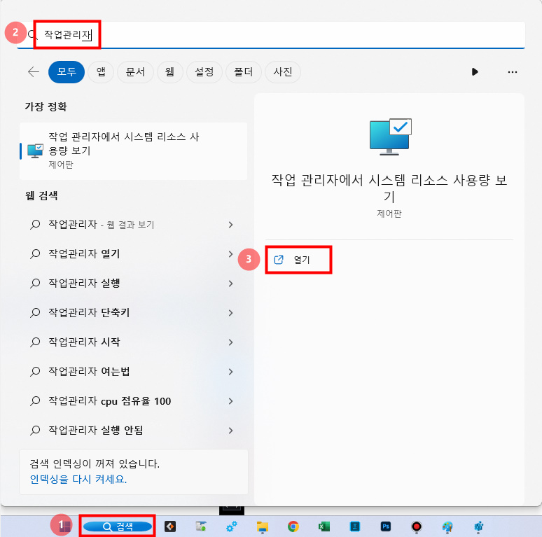 이번 엔 작업 관리자 입력 후 열기 클릭