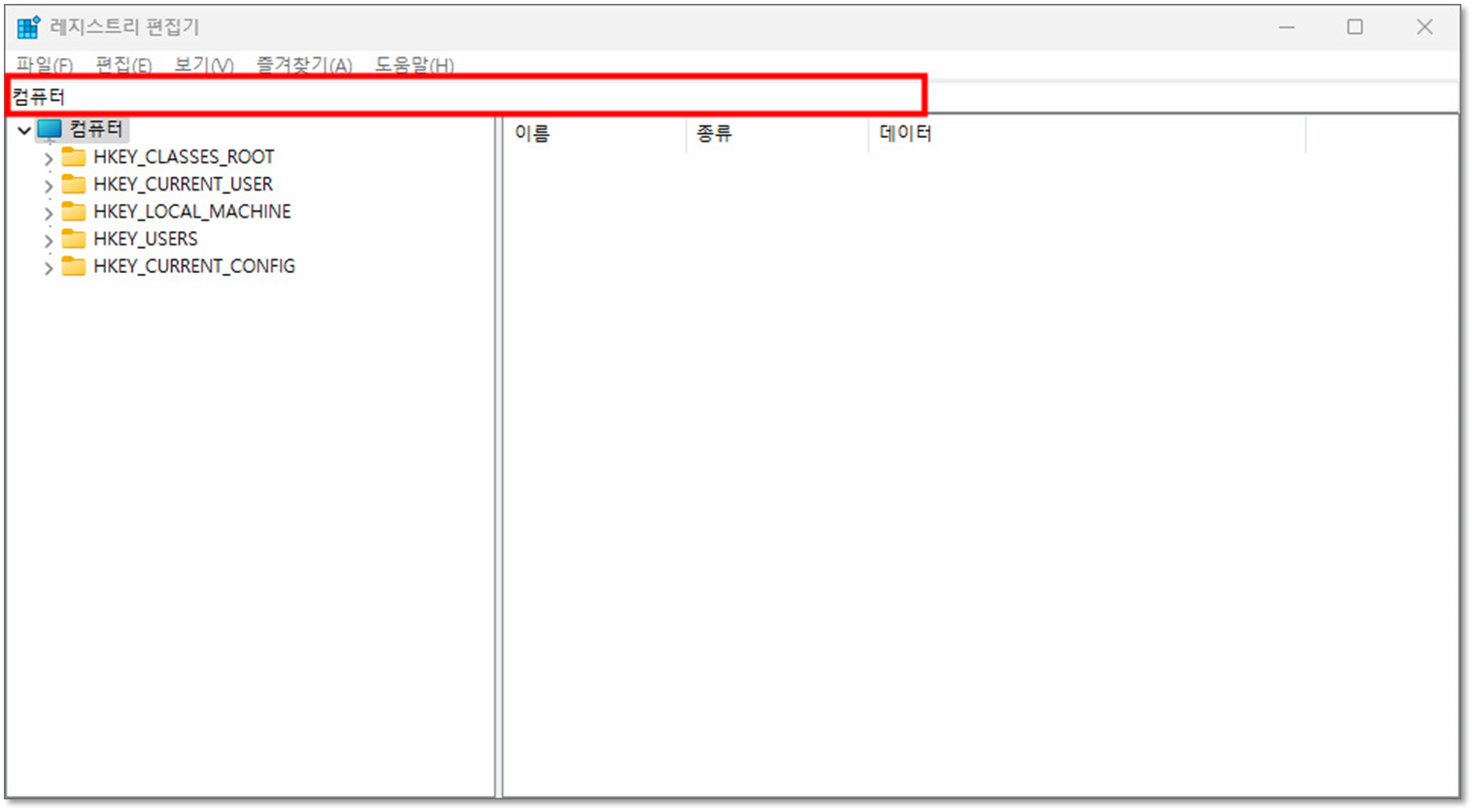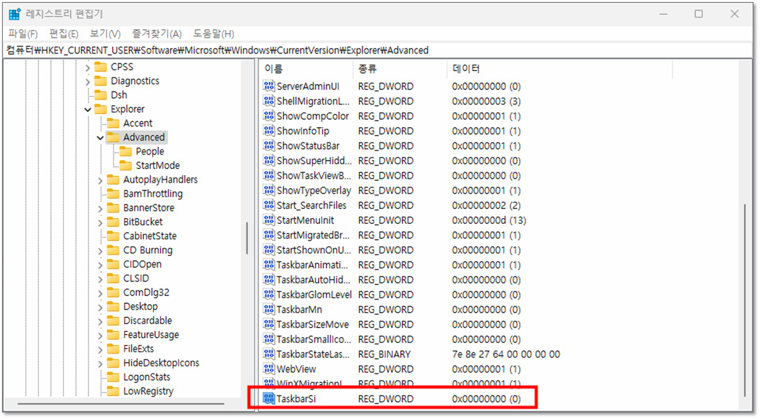 값 데이터 : 0 (작은크기의 작업표시줄)