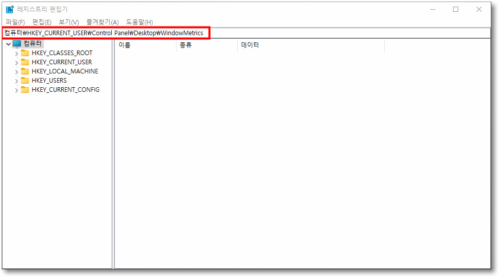 컴퓨터\HKEY_CURRENT_USER\Control Panel\Desktop\WindowMetrics